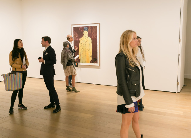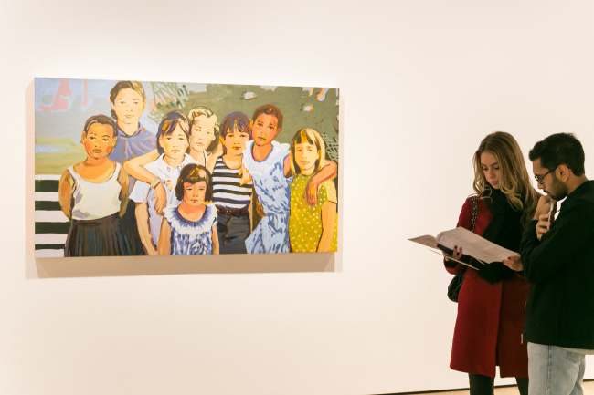 Photos from opening nights of Chloe Wise Not That We Don't (first 8 pics) and Claire Tabouret Portraits (second 9 pics) exhibitions of 2019 at Almine Rech gallery in Mayfair, London.